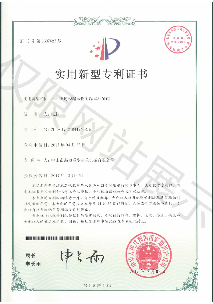 實用新型專利證書 -- 快速勾起重物的起重機吊鉤
