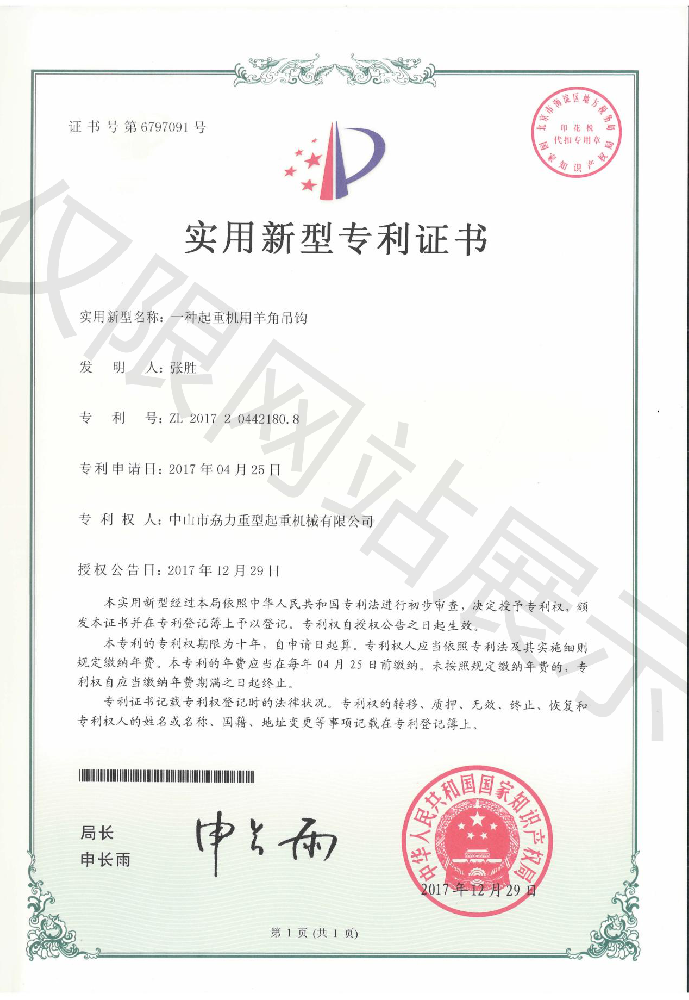 實用新型專利證書 -- 起重機用羊角吊鉤