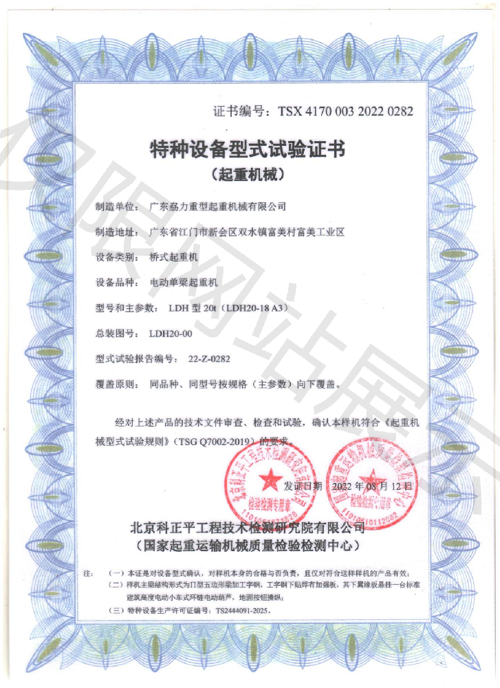 特種設備型式試驗證書--電動單梁起重機