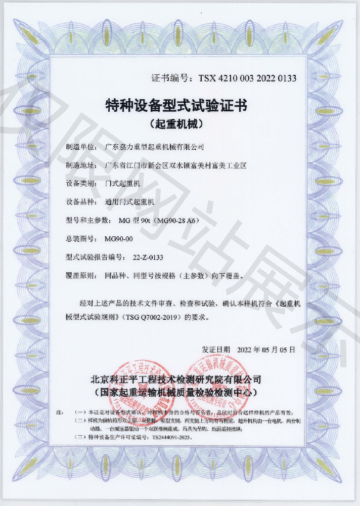 特種設備型式試驗證書--通用門式起重機